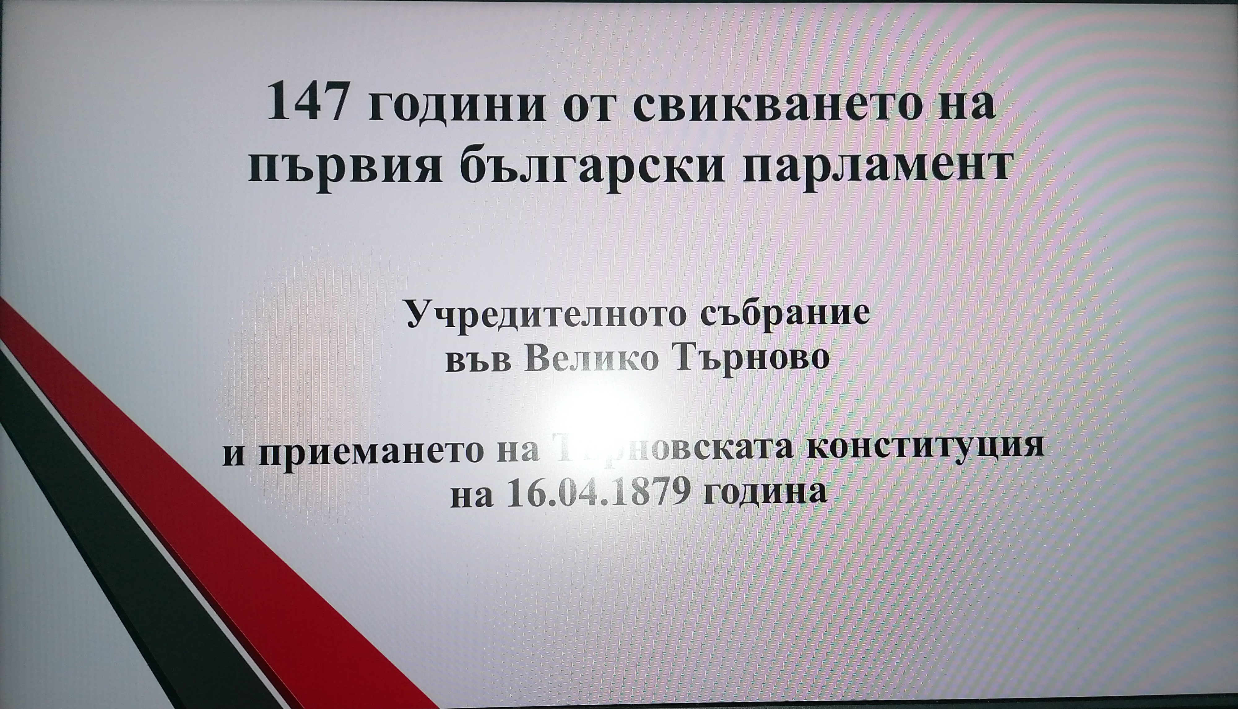 Денят на Конституцията е ден за гордост и преклонение пред нашите предци, които с приемането на Търновката конституция на 16.04.1879г. поставят началото и въвеждат конституционализма и законността като основополагащи принципи на устройството на младата българска държава.